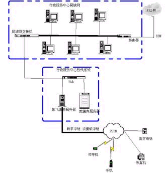 政府群眾一線通”系統(tǒng)可以通過局域網(wǎng)連入行政中心局域網(wǎng)交換機(jī),從而實現(xiàn)與整個行政服務(wù)中心的信息共享和熱線系統(tǒng)服務(wù)內(nèi)容的自動更新。具體網(wǎng)絡(luò)拓?fù)浣Y(jié)構(gòu)如下: