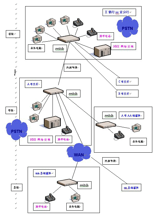 在銀行的省、市級分行分別部署一臺(tái)NBX網(wǎng)絡(luò)交換機(jī)——只需通過接入銀行系統(tǒng)內(nèi)部局域網(wǎng),經(jīng)過簡單的配置即可使用。然后根據(jù)需要,在市內(nèi)各個(gè)儲(chǔ)蓄所、各縣級儲(chǔ)蓄所配置相應(yīng)數(shù)量的數(shù)字話機(jī),那么在全省內(nèi)各個(gè)縣市區(qū)的各個(gè)營業(yè)網(wǎng)點(diǎn)之間,上下級之間就都可以使用數(shù)字電話機(jī)通過數(shù)據(jù)網(wǎng)免費(fèi)撥打語音電話。