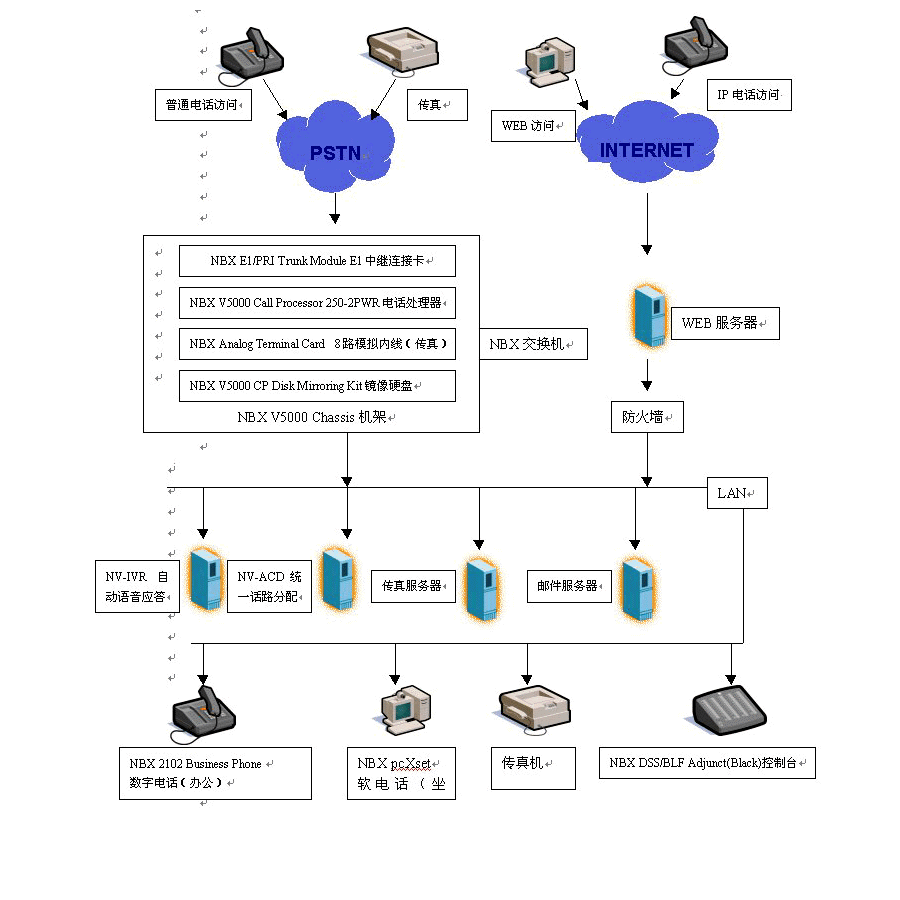 北京晨報的客戶服務(wù)中心項目是一個集呼叫中心與辦公系統(tǒng)于一體的語音、數(shù)據(jù)服務(wù)平臺。通過一條E1中繼線與外部電話網(wǎng)相聯(lián)。內(nèi)部使用50部數(shù)字電話進(jìn)行處理辦公業(yè)務(wù),10個呼叫中心坐席采用計算機(jī)的軟電話(pcXset)實現(xiàn)與客戶的交談,傳真服務(wù)器通過NBX所提供的8條模擬內(nèi)線與外界互通。