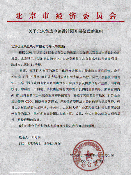 本次大會(huì)組委會(huì)及會(huì)議舉辦地點(diǎn)“天鴻科園大酒店”日前接到北京市人民政府通知,由于“北京集成電路設(shè)計(jì)園開園儀式”將于2002年4月18日至4月20日在大運(yùn)村、天鴻科園大酒店舉行開園儀式及相關(guān)活動(dòng),屆時(shí)將有北京市劉淇市長(zhǎng)、海燕市長(zhǎng)及國家信息產(chǎn)業(yè)部、國家科技部、中科院、中國電子科技集團(tuán)等有關(guān)部委和機(jī)構(gòu)的主要領(lǐng)導(dǎo)出席。按市領(lǐng)導(dǎo)指示,為配合此次重大活動(dòng)圓滿舉行,“首屆呼叫中心運(yùn)營(yíng)管理研討會(huì)”日期更改為2002年4月23日至4月25日在北京天鴻科園大酒店舉行,望有關(guān)參會(huì)單位做好相應(yīng)的后續(xù)工作。特此通告!