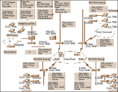 3524交換機(jī),它們能支持330多部思科IP 電話。各城市間的站點(diǎn)通過幀中繼WAN互相連接。在夏洛特斯維爾,3個基本速率接口(PRI)線路提供與公眾交換電話網(wǎng)(PSTN)的連接。由于SNL