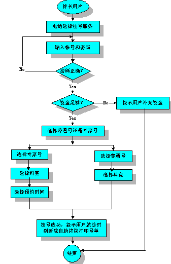 用戶連續(xù)三次輸入錯誤,則服務終止。用戶輸入帳號密碼正確,則系統(tǒng)查詢用戶帳號上的資金,資金足夠,則系統(tǒng)繼續(xù)提示:"普通門診按1,專家門診按2"。
