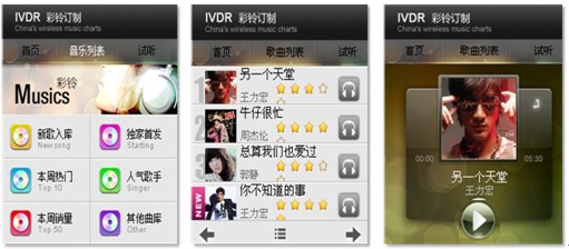 6)彩鈴定制業(yè)務(wù)。傳統(tǒng)彩鈴定制業(yè)務(wù)基于純語(yǔ)音IVR的環(huán)境下使用起來(lái)非常繁瑣,進(jìn)行彩鈴檢索比較麻煩,選擇的準(zhǔn)確度也很低。手機(jī)客戶端軟件的應(yīng)用,提供了可視化的交互方式,讓業(yè)務(wù)使用起來(lái)直觀便捷很多。用戶通過(guò)聲動(dòng)魅力完成彩鈴信息的瀏覽、試聽(tīng)、定制過(guò)程,用戶可以邊瀏歌曲的同時(shí)邊聽(tīng)到語(yǔ)音對(duì)歌曲的介紹,并可試用該歌曲。下圖即為彩鈴定制業(yè)務(wù)操作界面: