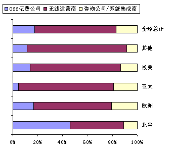 圖1、無線OSS計費市場:2000年全球按照地區(qū)劃分的不同公司類型的整體市場收入估計(百萬美元)