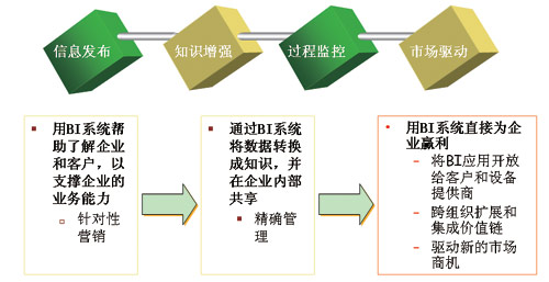 當(dāng)前國(guó)內(nèi)電信企業(yè)的BI應(yīng)用階段主要還在于信息發(fā)布和知識(shí)增強(qiáng),立足于使用BI系統(tǒng),幫助了解企業(yè)和客戶,以支撐企業(yè)的業(yè)務(wù)能力,例如提供一線客戶經(jīng)理、營(yíng)銷團(tuán)隊(duì)實(shí)時(shí)查詢客戶信息,進(jìn)行針對(duì)性營(yíng)銷。