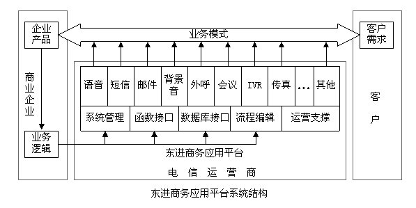 從應(yīng)用角度看,東進商務(wù)應(yīng)用平臺將業(yè)務(wù)分為3個部分--企業(yè)端的業(yè)務(wù)邏輯、電信運營商端的業(yè)務(wù)實現(xiàn)和客戶端業(yè)務(wù)響應(yīng)。企業(yè)根據(jù)其產(chǎn)品特點,制定相應(yīng)的業(yè)務(wù)邏輯,去控制電信運營商的商務(wù)應(yīng)用平臺,平臺在業(yè)務(wù)邏輯的控制下,去響應(yīng)客戶端的業(yè)務(wù)需求,由此組成一個智能化的業(yè)務(wù)模式。