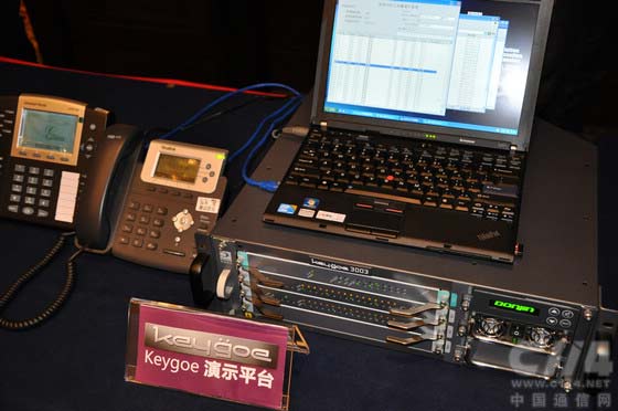 現(xiàn)場兩套演示系統(tǒng)中,一套以Keygoe 3000系列機箱承載最新研發(fā)的高密度VoIP資源處理板PFBT480X,實現(xiàn)整機最大1920路VoIP語音處理,展示了keygoe 3000多媒體交換機在大容量IP呼叫和語音處理的卓越性能。另一套則展示了最新的Keygoe1001系列多媒體交換機,該機通過內(nèi)置主控CPU板,將語音交換、語音處理以及應(yīng)用程序整合在一個高為1U的物理機箱中,為中小型規(guī)模業(yè)務(wù)應(yīng)用提供具有較強綜合性、靈活性和完整性的運營平臺。