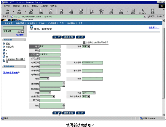 。。比如現(xiàn)在有一個(gè)新客戶(hù)黃航的電話13082856110呼入Ebanswers呼叫中心,console控制臺(tái)接收到這個(gè)電話號(hào)碼以后,會(huì)產(chǎn)生一個(gè)URL鏈接地址tel=217,以參數(shù)的形式附在調(diào)用的CRM頁(yè)面http://ecrm/crm2/default.asp?retURL=http://ecrm/crm2/search/searchtel_xml.asp后面,當(dāng)話務(wù)員登錄以后,就會(huì)彈出相應(yīng)的添加新線索頁(yè)面,話務(wù)員填寫(xiě)好相關(guān)信息后,按下"保存"按鈕就可以建立新線索了。