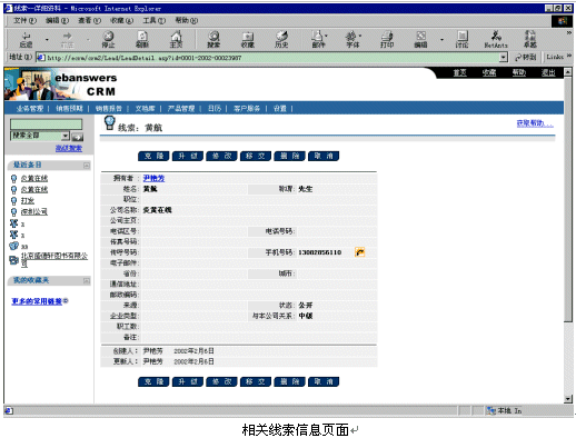 Ebanswers CRM系統(tǒng)去激活相關(guān)客戶(hù)資料的IE頁(yè)面進(jìn)行處理:如果此號(hào)碼數(shù)據(jù)庫(kù)中存在,則顯示此人的信息,如果不存在,則顯示CRM中添加新線索的頁(yè)面。而Ebanswers