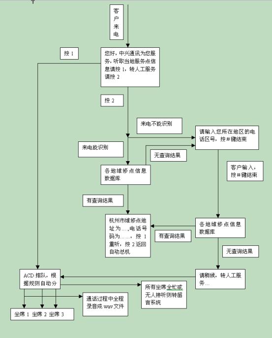 在中興通訊呼叫中心流程設(shè)計上充分體現(xiàn)了CTI技術(shù)以及數(shù)據(jù)庫技術(shù)等IT技術(shù)與星際先進的管理理念的融合。該流程的設(shè)計保證將主動提高服務品質(zhì)的工作集中于對呼叫者最重要的環(huán)節(jié)――對維修網(wǎng)點信息的咨詢上。它為所有呼叫者提供了詳細、精煉、基本的高品質(zhì)電話服務,同時又根據(jù)電話區(qū)號提供了有針對性的咨詢服務。