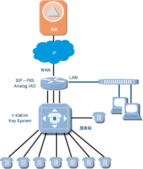 適用于支持模擬線的小交換機,經(jīng)SIPIAD設(shè)備將模擬線路轉(zhuǎn)換為基于IP的SIP信令流和媒體流,接入IMS系統(tǒng)。經(jīng)愛立信測試認證過的IAD產(chǎn)品有Mediatrix、Audiocodes、Linksys等。