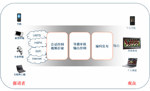如今手機(jī)能拍照、攝像并不稀奇,攝像頭幾乎成了手機(jī)的標(biāo)準(zhǔn)配置,視頻通話也是3G特色業(yè)務(wù)之一,但要把手機(jī)拍攝的圖像實(shí)時(shí)回傳到電視臺,并合理地發(fā)送到直播節(jié)目中卻還需要打通很多環(huán)節(jié)?偟膩碚f,電視臺需要的是一個(gè)業(yè)務(wù)控制平臺,使后臺導(dǎo)播人員能監(jiān)控、審核手機(jī)回傳的多路視頻信號,根據(jù)需要選取其中的合適內(nèi)容插入到直播節(jié)目中,同時(shí)系統(tǒng)還應(yīng)該能夠根據(jù)需求同時(shí)輸出各種格式的視頻,發(fā)布到電視頻道、互聯(lián)網(wǎng)或者手機(jī)電視中。