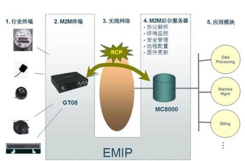 所有的M2M方案都具有的五要素是行業(yè)終端、M2M終端、無線傳輸網(wǎng)絡(luò)、M2M后臺(tái)服務(wù)器以及應(yīng)用模塊。為了能快速有效及低成本地適應(yīng)M2M市場上各種各樣的行業(yè)應(yīng)用,愛立信提出智能平臺(tái)EMIP的概念(如圖所示)。該智能平臺(tái)由GT08系列終端和MC8000管理服務(wù)器組成。
