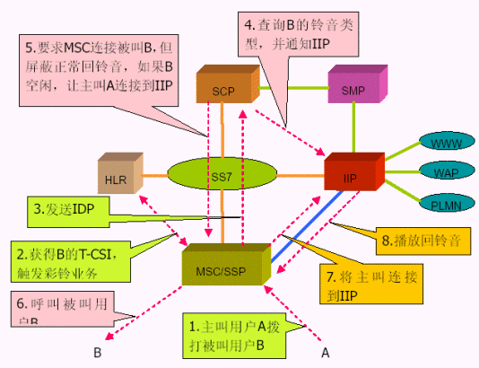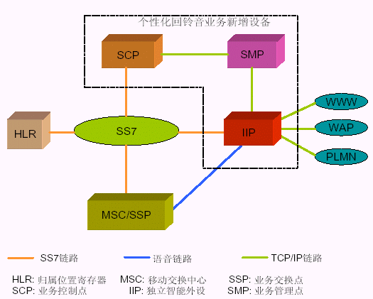 3. 智能網(wǎng)方式使用移動(dòng)智能網(wǎng)中的信令控制節(jié)點(diǎn)(SCP)實(shí)現(xiàn)智能業(yè)務(wù)的業(yè)務(wù)邏輯,新增的智能外設(shè)用于為用戶(hù)提供回鈴音和用戶(hù)管理功能。 個(gè)性化回鈴音業(yè)務(wù)是基于智能網(wǎng)系統(tǒng)的一個(gè)新業(yè)務(wù),在智能網(wǎng)中增加新的業(yè)務(wù)控制點(diǎn)(SCP)和獨(dú)立智能外設(shè)(IIP)。為此只需要為此業(yè)務(wù)加入基于Intel平臺(tái)的SCP和IP即可,前者是智能網(wǎng)體系中的業(yè)務(wù)控制設(shè)備,用于實(shí)現(xiàn)智能業(yè)務(wù)的業(yè)務(wù)邏輯,使用的是Intel高性能的c-PCI平臺(tái),支持高可靠性的冗余備份,提供業(yè)務(wù)呼叫控制和業(yè)務(wù)數(shù)據(jù)維護(hù)功能;后者是智能網(wǎng)獨(dú)立外設(shè),使用的是Inetl Dialogic的相關(guān)語(yǔ)音板卡,用于為個(gè)性化回鈴音用戶(hù)提供語(yǔ)音(回鈴音)、以及業(yè)務(wù)管理等功能。優(yōu)點(diǎn)是無(wú)須改動(dòng)現(xiàn)網(wǎng)上MSC/SSP 的軟件,通過(guò)采用SCP 查詢(xún)被叫用戶(hù)狀態(tài)的方式,只有當(dāng)被叫用戶(hù)處于空閑的情況下,才使用IIP 進(jìn)行處理,可以減少系統(tǒng)負(fù)荷,降低SSP 與IIP 之間話(huà)路的占用。缺點(diǎn)是需要MSC支持智能網(wǎng)業(yè)務(wù)。