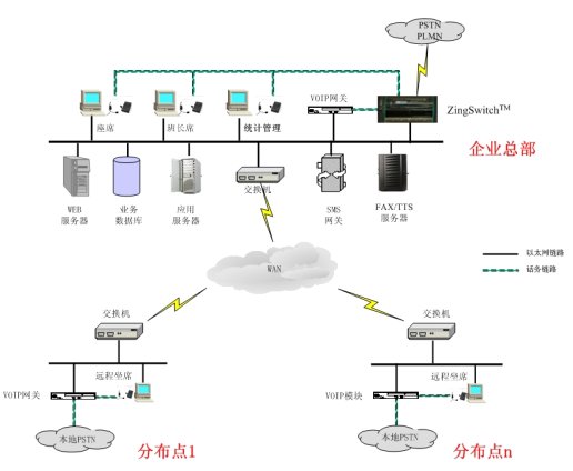 - 系統(tǒng)仍可同時(shí)在總部設(shè)立VoIP中心,用以實(shí)現(xiàn)數(shù)據(jù)和管理的集中,并且采用VoIP的方式,對(duì)各分布點(diǎn)的話務(wù)工作進(jìn)行集中的監(jiān)控。
