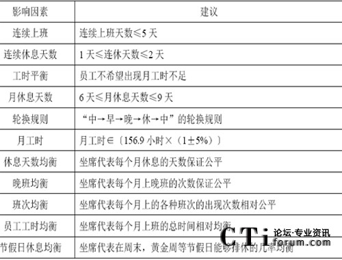 要滿足每半小時實際安排的座席數量不少于需要的座席數量的要求,首先就需要進行班次的設計,這是為第五環(huán)節(jié)資源規(guī)劃而準備的!鞍啻卧O計”是指設計出一系列的班次,比如早班,中班,晚班,等等。而將來只要告訴員工,你下個月每天各上什么樣的班次即可。在班次設計時,需要充分考慮前面提到的一些影響因素:如下所示。