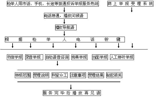 本系統(tǒng)充分借助計算機及通迅線路的優(yōu)勢,將高度普及的電話線路,同高科技的計算機處理緊密結合起來,通過電話語音這一人類最易溝通交流的途徑和手段,將檢舉人和檢察院緊密結合起來。檢舉人通過簡單的拔通服務電話,使用電話按鍵,利用自動語音導航和人工服務,實現以上熱線投訴舉報的自動咨詢及人工服務的各項功能。
