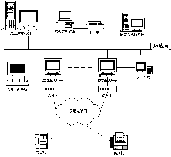 管理終端通道設(shè)置、業(yè)務(wù)內(nèi)容設(shè)置、操作人員管理,打印各種報表、報警數(shù)據(jù)。上面安裝綜合管理子系統(tǒng),操作系統(tǒng)為Windows 95/98/2000。