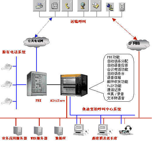 您的企業(yè)內部已有一套大型的交換機系統(tǒng),但非常希望在銷售、技術支持等與客戶接觸頻繁的部門,建立自己的客戶服務中心系統(tǒng),此時您只需要將奧迪堅高度整合的呼叫中心平臺掛接在您的交換機后端即可。
