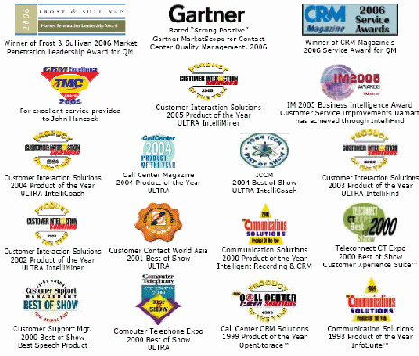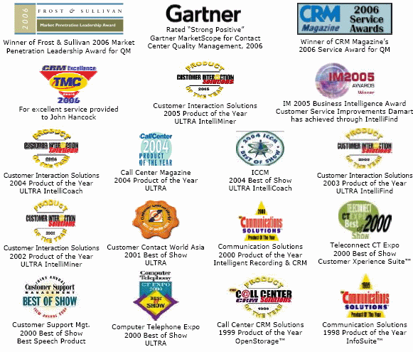 ULTRA的呼叫中心解決方案提供呼叫中心管理者可供操作的智能信息,用以改善呼叫中心聯(lián)絡(luò)客戶的每一個(gè)程序和流程。 3.所獲獎(jiǎng)項(xiàng)