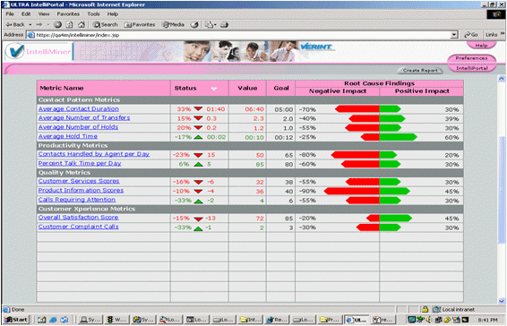 IntelliMiner 使用專利的數(shù)據(jù)挖掘技術(shù),自動(dòng)分析導(dǎo)致呼叫中心關(guān)鍵行為指標(biāo)(KPI)和呼叫中心設(shè)定目標(biāo)的因素及其關(guān)系和影響。所分析的數(shù)據(jù)揭示了導(dǎo)致呼叫中心KPI表現(xiàn)的潛在原因,例如過(guò)長(zhǎng)的通話時(shí)間,過(guò)多的轉(zhuǎn)接次數(shù),過(guò)長(zhǎng)的保持時(shí)間,導(dǎo)致了降低生產(chǎn)力和降低客戶滿意度。IntelliMiner是質(zhì)量管理子系統(tǒng)的一個(gè)選項(xiàng)。