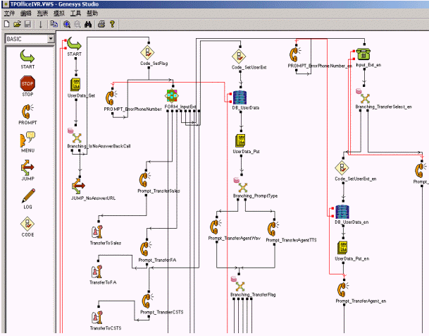 GVP提供了界面友好的功能強(qiáng)大的語音應(yīng)用開發(fā)工具-Genesys Studio,其中預(yù)定了豐富的控件,用來實(shí)現(xiàn)菜單語音播報(bào)、DTMF收集以及對數(shù)據(jù)庫查詢等諸多功能。通過拖放的方式就可以快速的隨心所欲地設(shè)計(jì)出你所需要的語音邏輯應(yīng)用流程,最終編譯產(chǎn)生用于發(fā)布的ASP或者JSP頁面。應(yīng)用之間可以彼此調(diào)用,提高了語音應(yīng)用的靈活性和可重用性。Genesys Studio還提供了靈活實(shí)用的調(diào)試工具,可以隨意設(shè)置斷點(diǎn)實(shí)時(shí)跟蹤流程的執(zhí)行情況,極大的方便了語音應(yīng)用流程的調(diào)試。