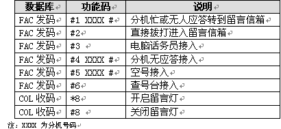 若您要的分機正在忙或分機主人不在電話機旁,可直接轉(zhuǎn)到留言信箱,止項功能要求在交換機數(shù)據(jù)庫中設(shè)置分機遇忙/無應(yīng)答轉(zhuǎn)移到留言信箱。