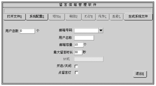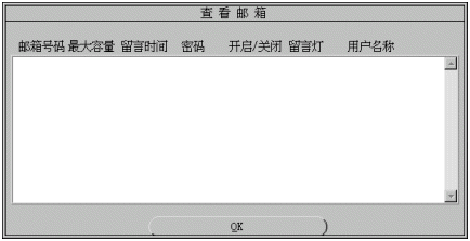 1). 您可修改的參數(shù)有:用戶名稱、用戶密碼、信箱容量、最大留時長、開啟/關(guān)閉、點留言燈。有關(guān)參數(shù)的細節(jié)將在增加信箱一節(jié)中介紹。