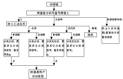 電腦話務(wù)員/語音信箱系統(tǒng)的語音流程圖如下圖。