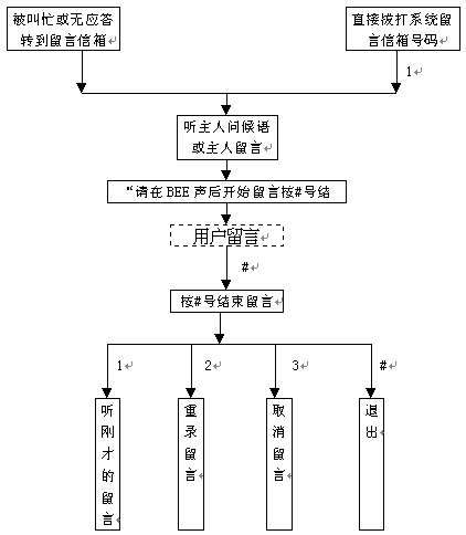 3). 如果該分機在使用或者此時主人不在分機旁,根據(jù)系統(tǒng)設(shè)置,交換機等待一會兒后自動將電話轉(zhuǎn)到留言信箱,如果信箱主人有主人留言的話,系統(tǒng)會播報信箱主人留言,然后系統(tǒng)繼續(xù)提示"請在BEE聲后留言,結(jié)束請按#號'BEE'"。