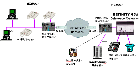 隨著IP網(wǎng)絡(luò)技術(shù)的不斷發(fā)展,數(shù)據(jù)網(wǎng)絡(luò)的融合能力越來越強(qiáng)。AVAYA在全球范圍內(nèi)率先推出全面符合H.323標(biāo)準(zhǔn)的VoIP解決方案及基于IP中繼的DCS/Q.sig專網(wǎng)透明功能信令。通過IP中繼將公司全部分支包括機(jī)構(gòu)的DEFINITY交換機(jī)進(jìn)行連接,同樣可以提供全面的專網(wǎng)透明功能和網(wǎng)絡(luò)呼叫中心應(yīng)用,DEFINITY IP中繼可提供豐富的語音壓縮能力,從64Kbps的無壓縮傳輸?shù)?Kbps的經(jīng)濟(jì)傳輸方案均可提供,同時通過復(fù)用在IP包中的DCS/Q.sig信令提供透明功能。