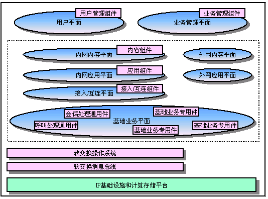 從結(jié)構(gòu)上看,業(yè)務(wù)驅(qū)動的軟交換平臺是一個復(fù)雜的多域多層組件平臺。一個電信業(yè)務(wù)的實現(xiàn)是對平臺上的組件的組裝過程。業(yè)務(wù)驅(qū)動的軟交換平臺上的組件分為用戶平面、基礎(chǔ)業(yè)務(wù)平面、接入/互連/移動控制平面、應(yīng)用平面、內(nèi)容平面和業(yè)務(wù)管理平面。用戶平面的組件負(fù)責(zé)維護(hù)用戶的注冊信息、位置信息、狀態(tài)信息、業(yè)務(wù)信息和業(yè)務(wù)使用信息。基礎(chǔ)業(yè)務(wù)平面的組件分為三大類型:電路基礎(chǔ)業(yè)務(wù)、包交換基礎(chǔ)業(yè)務(wù)和多媒體交換基礎(chǔ)業(yè)務(wù)。每個基礎(chǔ)業(yè)務(wù)分成傳輸層、承載層、媒體層、呼叫處理層和業(yè)務(wù)層,其中的控制包括了對各層功能的控制協(xié)議和層間交互的控制協(xié)議。接入/互連/移動控制平面中包含了對各種接入網(wǎng)絡(luò)的控制、對互聯(lián)網(wǎng)絡(luò)的控制和對移動性的控制協(xié)議,也分成傳輸層、承載層、媒體層、呼叫處理層和業(yè)務(wù)層的控制組件。應(yīng)用平面的組件分為三種類型,基于傳統(tǒng)智能網(wǎng)(IN,