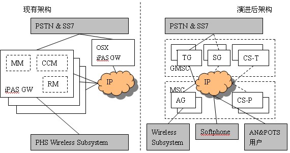 GW軟件改造而來,只需新增CS-P即可。總的來說,核心網(wǎng)的演進(jìn)只是增加CS-P、擴(kuò)容CS-T、原有的iPAS GW軟件升級為TG/AG,就可以建立其一個(gè)具有多種終端接入能力的開放性多媒體VoIP移動軟交換網(wǎng)絡(luò),而原有的PHS系統(tǒng)功能又不會受到影響。