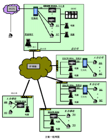 。。本方案有主要配置:總公司配備1臺EEGW8601E1網(wǎng)關(guān)、四個分公司分別配備1臺EEGW8504FXO網(wǎng)關(guān),四個辦事處分別配備1臺EEGW8204FXO網(wǎng)關(guān)。在總公司出可以安裝EEGK8001簡易網(wǎng)閘。
