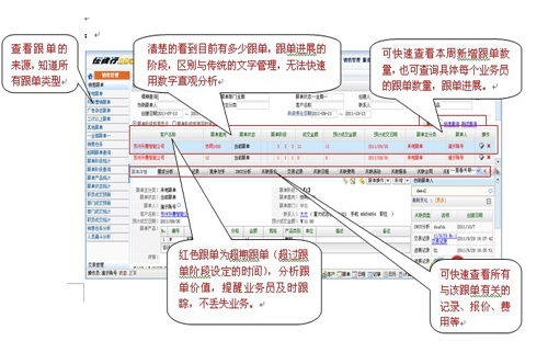 2、通過軟件對跟單的業(yè)務(wù)進(jìn)展記錄固化,清晰掌握該跟單由誰創(chuàng)建、誰去談單、報價有無競爭對手、有無難點(diǎn)等進(jìn)展一覽無余,避免了傳統(tǒng)的電話、面對面溝通。