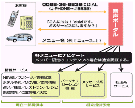 首先撥星號*(0088-36-8839,J-PHONE是#8839),接通后則是VOIZI主菜單,在電話員小姐的導(dǎo)播之后您可說出您希望的菜單,即可連接。之后再根據(jù)導(dǎo)播說出自己的希望,繼續(xù)進(jìn)行使用。