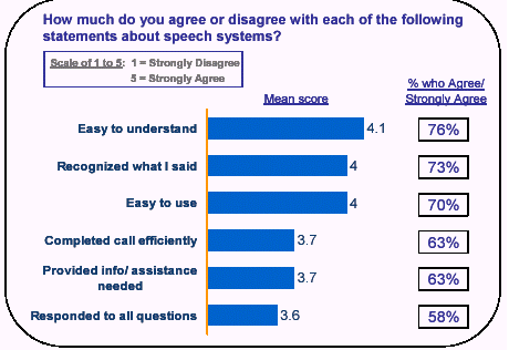 被訪問者們例舉了語音系統(tǒng)的很多優(yōu)點。超過75%的人認為語音服務方便易用,有三分之二的使用者說語音服務不僅為他們提供了準確的信息同時也為他們節(jié)省了等待客戶服務員的時間。