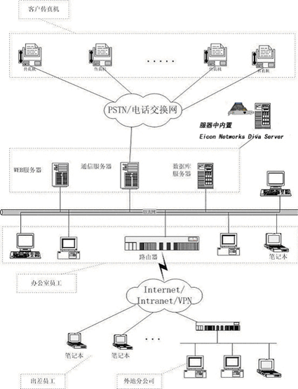 本系統(tǒng)采用最新的J2EE WEB技術(shù),在組成結(jié)構(gòu)上主要由以下三大模塊組成:1)WEB服務(wù)器: 完成用戶通過IE瀏覽器接入訪問, 傳真發(fā)送及接收的操作界面,傳真結(jié)果的查詢,客戶地址本的維護(hù)等工作;2)傳真發(fā)送/接收通信服務(wù)器:主要完成驅(qū)動傳真板卡,通過通信線路收發(fā)傳真,檢測通信線路、對方狀態(tài),發(fā)送接收隊(duì)列管理等工作;3)數(shù)據(jù)庫服務(wù)器:主要負(fù)責(zé)用戶信息,用戶地址本信息,傳真記錄等信息存儲工作。