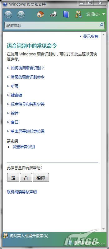 如果你不明白一些事要如何操作,你可以通過說“我能說什么”來使用幫助。在使用“我能說什么”命令之后,Windows的幫助和支持就會彈出,你可以在里面尋找你所需要的幫助信息。