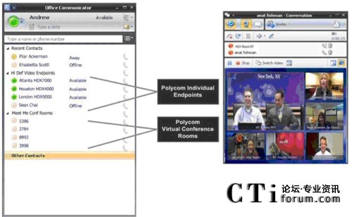 RMX 虛擬會議室出現(xiàn)在 Office Communicator 2007 聯(lián)系人列表上,用戶點(diǎn)擊即可加入多點(diǎn)通話。這樣, 商業(yè)用戶就可以在 PC 和高品質(zhì)視頻終端上輕松開展協(xié)作,并保持與各方隨時溝通。