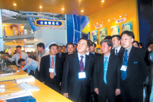 金弘基先生(前排左一)帶領(lǐng)參觀者參觀三星SDS公司在COMDEX/China 2002上的展臺。