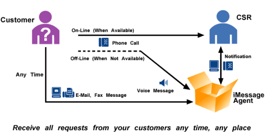 iMessage Agent可與您已有的ACD系統(tǒng)集成,當目標CSR不在時電話系統(tǒng)就將呼叫交付給iMessage Agent,iMessage Agent接到呼叫之后將對呼叫方進行合適的問候,再將消息存儲在郵件服務器中。根據(jù)預定義的規(guī)則,消息會被隨后路由到正確的消息框中。
