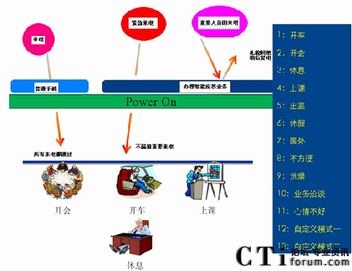 智能應(yīng)答提供給用戶的是“情景”選擇,通過情景選擇,用戶以情景模式來進行應(yīng)答。 除了有默認(rèn)的11種情景模式之外,用戶還可以自定義2種個性化情景模式。您可以通過短信設(shè)置、電話設(shè)置或網(wǎng)絡(luò)設(shè)置進行自定義模式設(shè)置。情景模式有三種使用方式:一是預(yù)設(shè)情景方式,二是菜單選擇方式,三是默認(rèn)選擇方式。在預(yù)設(shè)情景方式中,系統(tǒng)對用戶不方便接聽電話的常用情景進行預(yù)設(shè),預(yù)設(shè)可以選擇以上13種模式種的一種,也可以按照主叫號碼和時間段靈活設(shè)置,當(dāng)用戶一旦處于忙狀態(tài),直接按照用戶預(yù)設(shè)的情景執(zhí)行,無需用戶的參與。在菜單選擇方式中,當(dāng)用戶一旦處于忙狀態(tài),根據(jù)用戶具體的菜單選擇情景執(zhí)行。在默認(rèn)選擇方式中,如果用戶沒有預(yù)設(shè),并且在彈出菜單選擇之后,用戶在規(guī)定的時間段內(nèi)沒有任何選擇,執(zhí)行默認(rèn)的選擇模式。