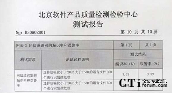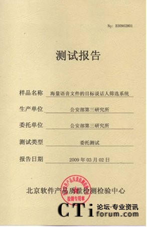 CTI論壇(ctiforum)06月25日消息: 2009年3月02-10日:北京軟件產品質量檢測檢驗中心對《海量語音文件的目標說話人篩選系統》進行了全面測試包括用戶文檔、功能性、可靠性、易用性、可維護性等多個特性。測試結果表明《海量語音文件的目標說話 2009年3月02-10日,北京軟件產品質量檢測檢驗中心對《海量語音文件的目標說話人篩選系統》進行了全面人篩選系統》滿足軟件相關國家標準中的要求,系統在模擬測試環(huán)境中運行正常、穩(wěn)定,正式通過北京軟件產品質量檢測檢驗中心的嚴格測試,系統的漏識率和誤警率分別達到了2.81%和 2.81%。