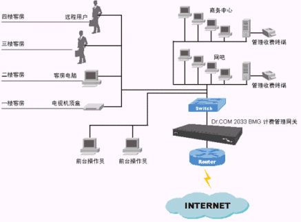 利用Dr.COM 2033BMG,配合路由器、五類雙絞線(或者機(jī)頂盒、ADSL),實(shí)現(xiàn)計(jì)費(fèi)和客房Internet寬帶接入。