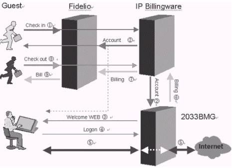 本方案將Dr.COM計(jì)費(fèi)系統(tǒng)作為一個(gè)部件嵌入到酒店現(xiàn)有的管理軟件系統(tǒng)里。這樣做的好處是酒店經(jīng)營者不必面對兩套系統(tǒng)。