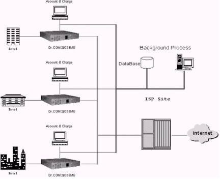 本文提出的方案就是采用第二種方案設(shè)計(jì)的。所采用的互聯(lián)網(wǎng)接入服務(wù)器就是一臺Dr.COM(通訊博士) 2033 BMG 計(jì)費(fèi)管理網(wǎng)關(guān),每個(gè)客人入住登記時(shí),如果需要申請開通互聯(lián)網(wǎng)服務(wù),服務(wù)員開通一個(gè)賬號,由客人自己輸入一個(gè)密碼?腿司涂梢栽诜块g使用自己的手提電腦或酒店提供的電腦,通過酒店的局域網(wǎng)訪問互聯(lián)網(wǎng)。等客人結(jié)賬離開前,可以打印出上網(wǎng)的詳細(xì)紀(jì)錄,作為客人的結(jié)賬單。也可以提供一個(gè)賬單紀(jì)錄的數(shù)據(jù)出口,連接到酒店的服務(wù)器,由酒店的服務(wù)器進(jìn)行計(jì)費(fèi)管理。