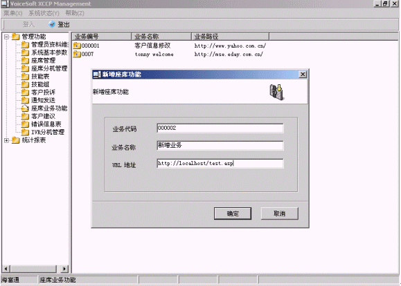 當(dāng)人工座席登陸后,XCCP Agent從系統(tǒng)數(shù)據(jù)庫(kù)加載業(yè)務(wù)菜單,每個(gè)業(yè)務(wù)菜單都對(duì)應(yīng)一個(gè)URL,當(dāng)話務(wù)員點(diǎn)擊業(yè)務(wù)菜單時(shí),系統(tǒng)就訪問(wèn)對(duì)應(yīng)的URL,效果顯示在座席瀏覽器上;系統(tǒng)同時(shí)將呼叫信息或從其他座席和IVR得到的UUI信息傳送給相應(yīng)的頁(yè)面,有頁(yè)面對(duì)這些信息自行處理;菜單和URL的對(duì)應(yīng)關(guān)系由XCCP Management進(jìn)行配置;如果業(yè)務(wù)系統(tǒng)本身就是瀏覽器模式的,這樣的結(jié)構(gòu)可以將這些終端界面直接嵌入座席系統(tǒng)中,無(wú)需進(jìn)行二次開(kāi)發(fā)和進(jìn)行接口定義。下面是配置界面: