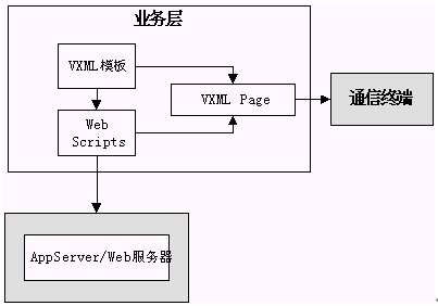 用于存放和產(chǎn)生VoiceXML腳本文檔,可以是一個(gè)文件系統(tǒng)或WEB服務(wù)器,一般文件系統(tǒng)應(yīng)用于靜態(tài)腳本,WEB服務(wù)器應(yīng)用于動(dòng)態(tài)腳本;存放應(yīng)用邏輯組件或中間件,通過(guò)對(duì)后臺(tái)業(yè)務(wù)系統(tǒng)訪問(wèn),動(dòng)態(tài)產(chǎn)生VoiceXML頁(yè)面,進(jìn)行事務(wù)處理