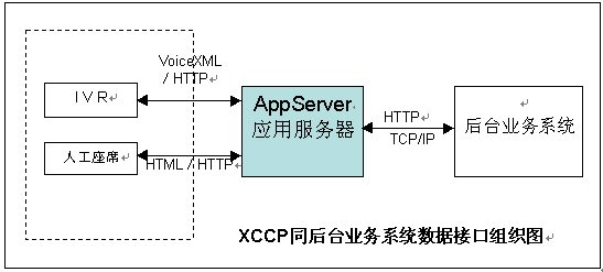 可以看出AppServer應(yīng)用服務(wù)器是外部系統(tǒng)同XCCP呼叫中心系統(tǒng)接口的核心模塊,由于XCCP采用開(kāi)放協(xié)議和標(biāo)準(zhǔn),應(yīng)用服務(wù)器實(shí)際就是一個(gè)Web服務(wù)器,因此同后臺(tái)業(yè)務(wù)系統(tǒng)接口技術(shù)不受XCCP系統(tǒng)的限制,只要Web服務(wù)器能支持通信技術(shù)在這里都全面支持,下面都分別進(jìn)行舉例說(shuō)明;如果有些通信技術(shù)在下面描述中沒(méi)有涉及到的,但是Web技術(shù)支持的,應(yīng)用服務(wù)器都支持。